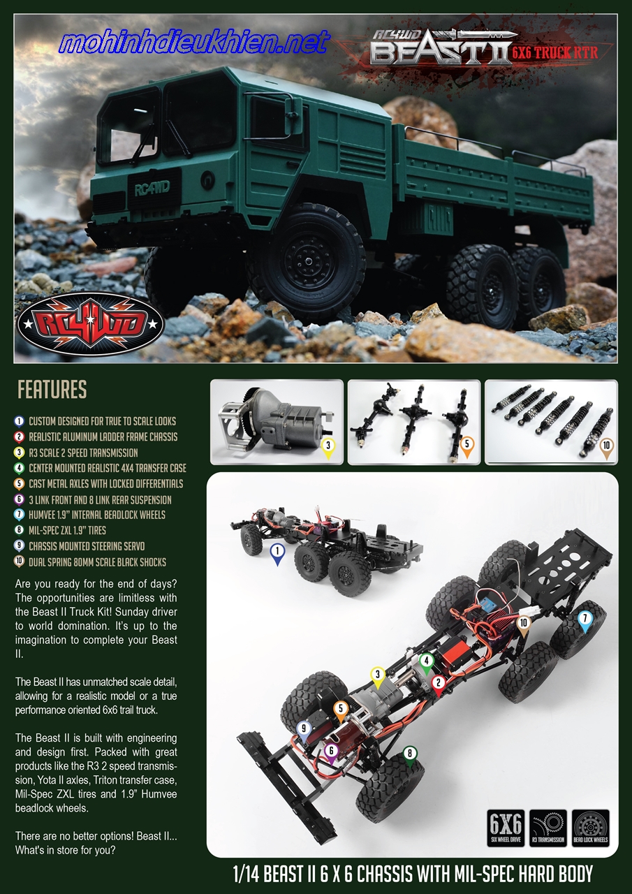 The Beast II 6x6 Chassis với Mil-Spec Body cứng. The Beast II Body có một loại tuyệt vời của các chi tiết quy mô kể cả gương, người giữ lốp dự phòng và xử lý để tái tạo một 1:. Xe 1