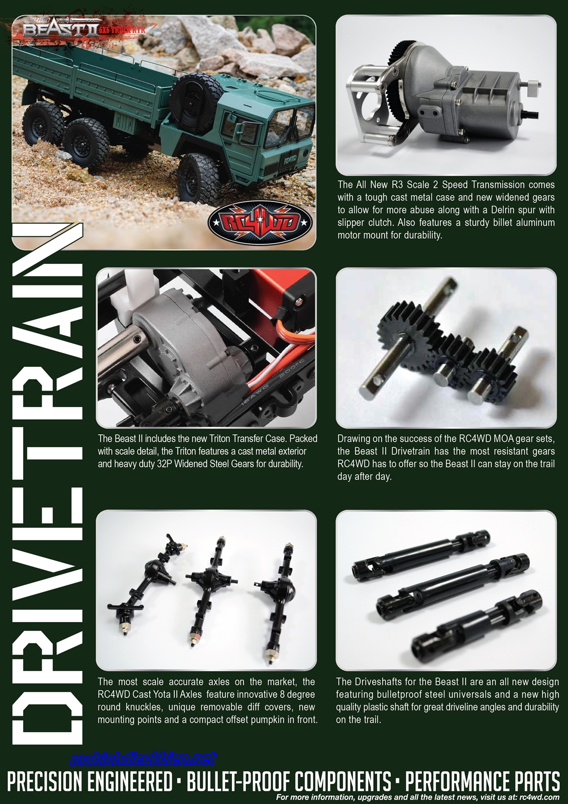 Dựa trên sự thành công của bộ răng RC4WD MOA, Beast II hệ thống truyền động có các bánh răng chịu nhất RC4WD đã cung cấp rất Beast II có thể ở vào ngày đường mòn qua ngày.