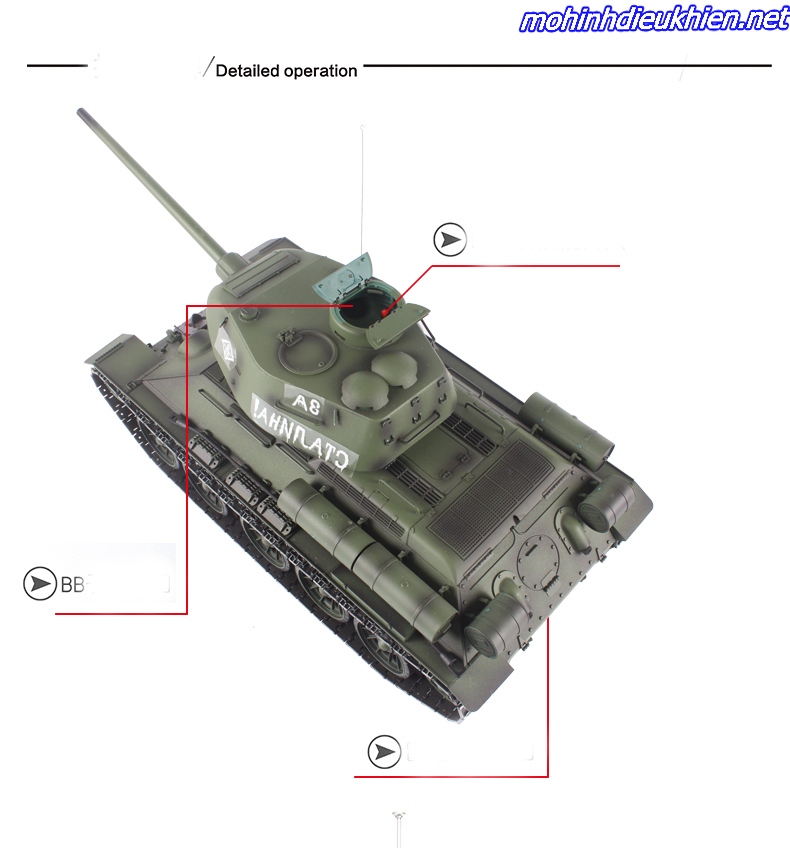 Tính năng & Vận hành Chạy điện với mọi chức năng hoàn toàn y như một chiếc xe tăng thật, kễ cả khả năng vượt địa hình và bắn súng. Xe trang bị hệ thống bánh xích kim loại, cho phép leo trèo tốt và lái y xe tăng thật, nghĩa là có thể chạy tới, lùi và quay vòng 380 độ cực nhanh. Tháp pháo cũng vận hành bằng motor và quay 360độ. Súng đại bác nâng lên và hạ xuống bằng điện. tất cả vận hành thông qua điều khiển trên remote. Xe tăng của hãng HENGLONG có ưu thế ở việc tích hợp 1 khẩu súng hơi chạy bằng điện có thể bắn đạn liên tục tạo cảm giác trung thực và rất phấn khích. Ngoài ra, xe còn có 1 bộ mạch giả lập điện tử phát ra tiếng máy, tiếng "gầm" và tiếng súng đại liên y như thật (VIVID SIMULATION OF ACTION OF ACTUAL BATTLE TANK)